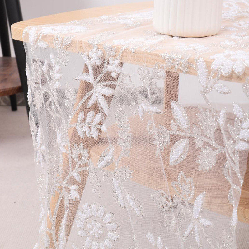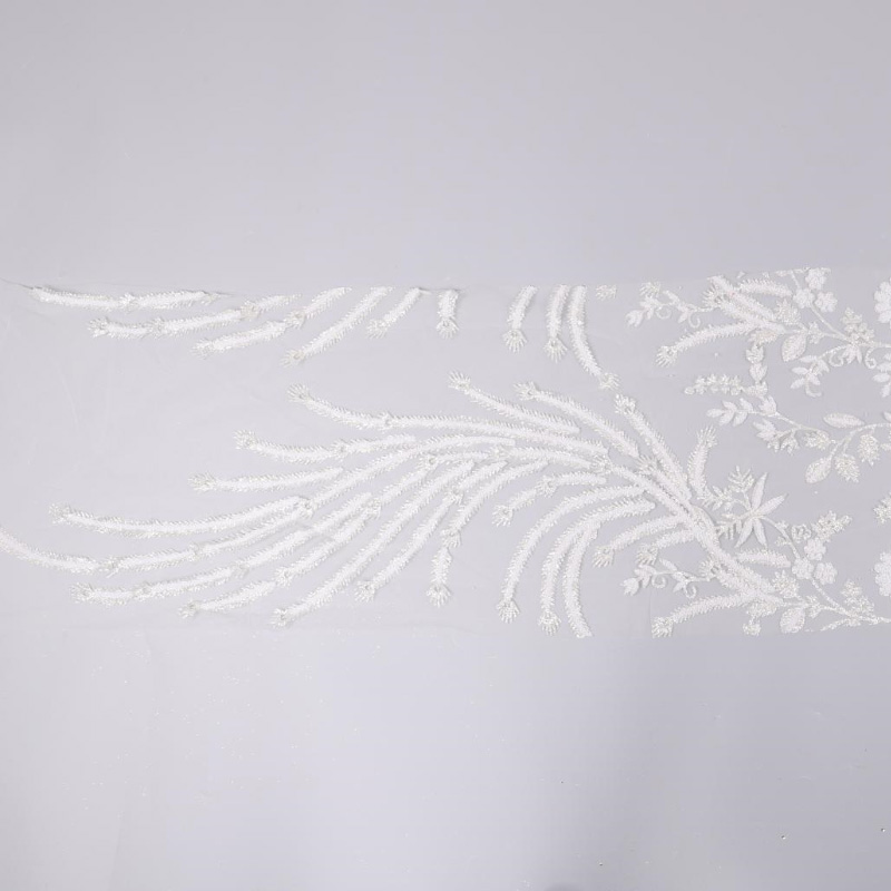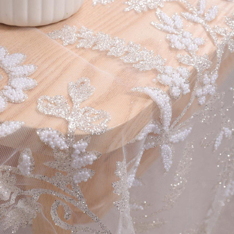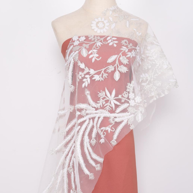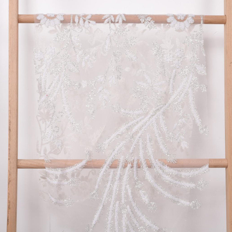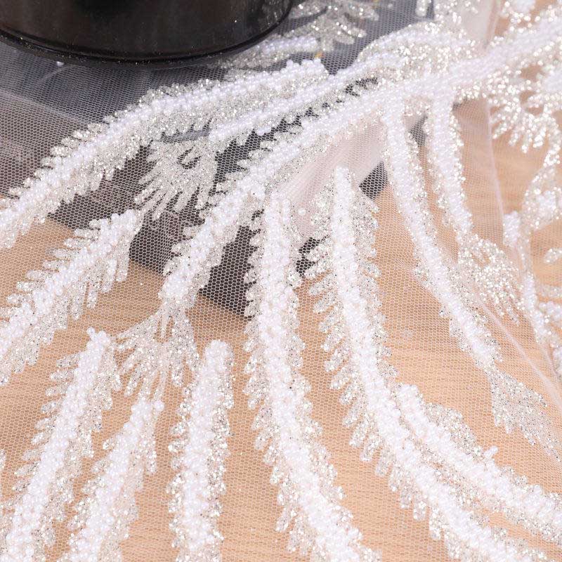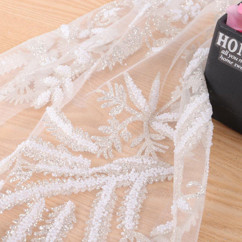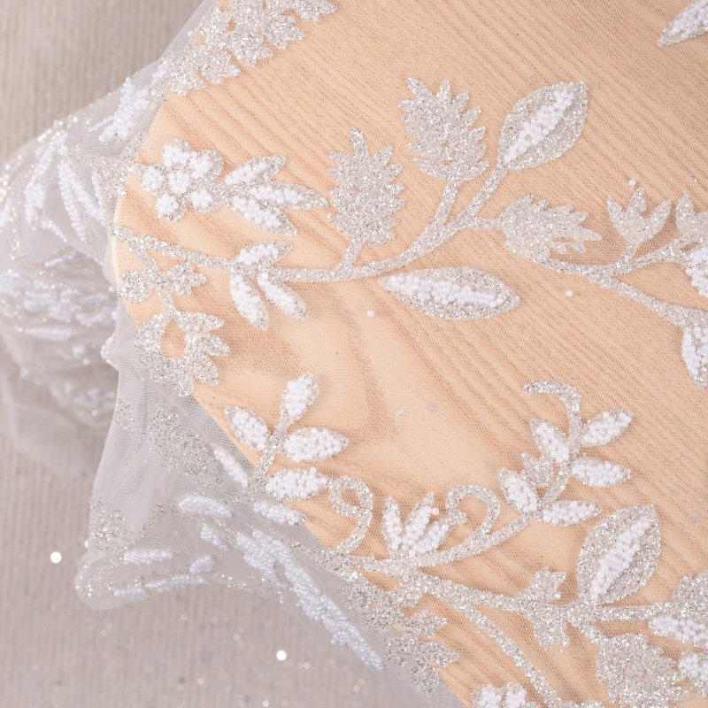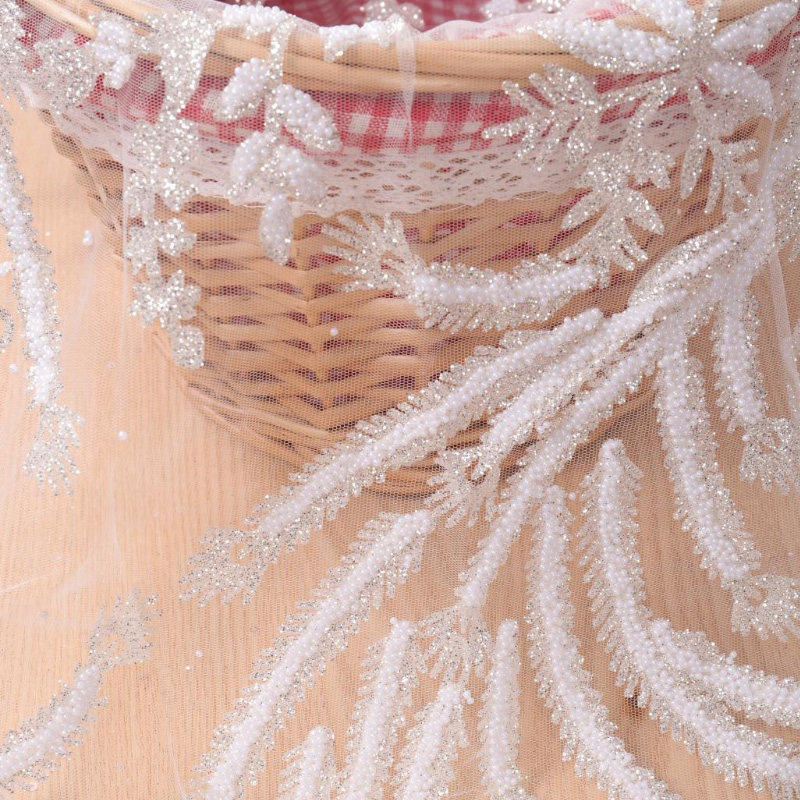 Wykorzystując koronkową tkaninę, materiały użyte na tkaninie obejmują spienianie, klejone koraliki, cekiny z dziurami, wiertła stereo, cekiny, koraliki, perły itp. Większość tkanin to połączenie małych cekinów i innych materiałów… wyglądać bardziej trójwymiarowo i pięknie.